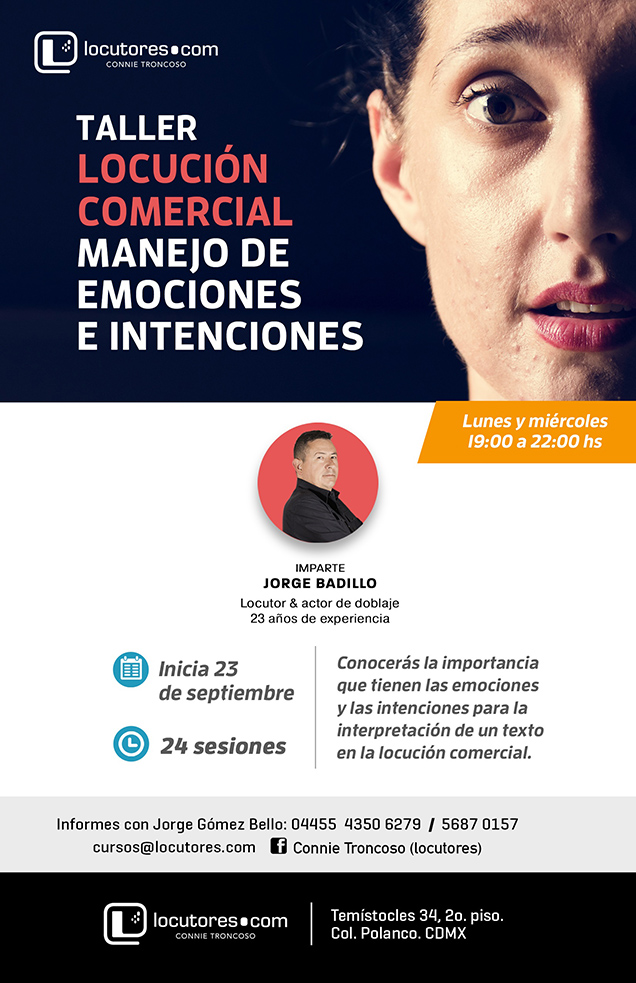 Hola, mi nombre es Carmen Ramirez, el taller que imparte Jorge Badillo es una grata experiencia, me ayudó a manejar mis emociones para poder expresarlas en cada comercial, al igual que mi vida cotidiana, altamente recomendable.