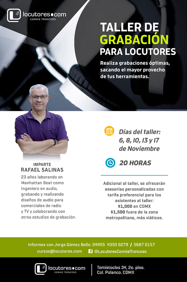 ¿Eres locutor y buscas tener grabaciones con mayor calidad, lograr mejores tomas para enviar tus castings?. Resuelve estas y otras dudas con Rafa Salinas, ingeniero de audio con más de 23 años de experiencia, aprende técnicas para grabarte de manera emergente.