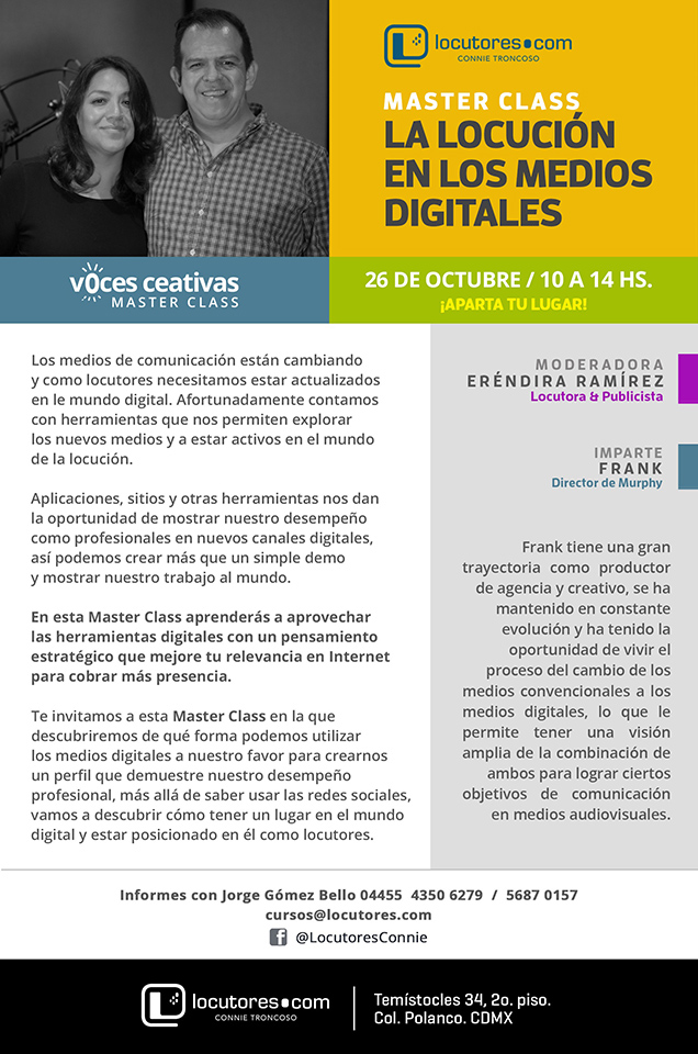 Los medios de comunicación están cambiando y como locutores necesitamos estar actualizados en le mundo digital. Afortunadamente contamos con herramientas que nos permiten explorar los nuevos medios y a estar activos en el mundo de la locución. Nuevo